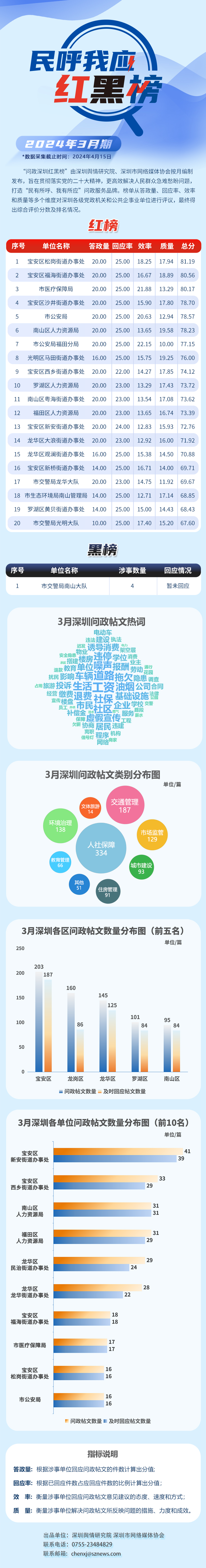 2024年3月,共有20家單位因積極開(kāi)展網(wǎng)絡(luò)答政工作,贏得群眾的支持與認(rèn)可,最終登上“紅榜”,它們分別是:寶安區(qū)松崗街道辦事處、寶安區(qū)福海街道辦事處、市醫(yī)療保障局、寶安區(qū)沙井街道辦事處、市公安局、南山區(qū)人力資源局、市公安局福田分局、光明區(qū)馬田街道辦事處、寶安區(qū)西鄉(xiāng)街道辦事處、羅湖區(qū)人力資源局、南山區(qū)粵海街道辦事處、福田區(qū)人力資源局、寶安區(qū)新安街道辦事處、龍華區(qū)大浪街道辦事處、龍華區(qū)觀瀾街道辦事處、寶安區(qū)新橋街道辦事處、市交警局龍華大隊(duì)、市生態(tài)環(huán)境局南山管理局、羅湖區(qū)黃貝街道辦事處、市交警局光明大隊(duì)。另外,市交警局南山大隊(duì)因相關(guān)帖文回應(yīng)率偏低,整體答政效果不佳,被列入了“黑榜”。